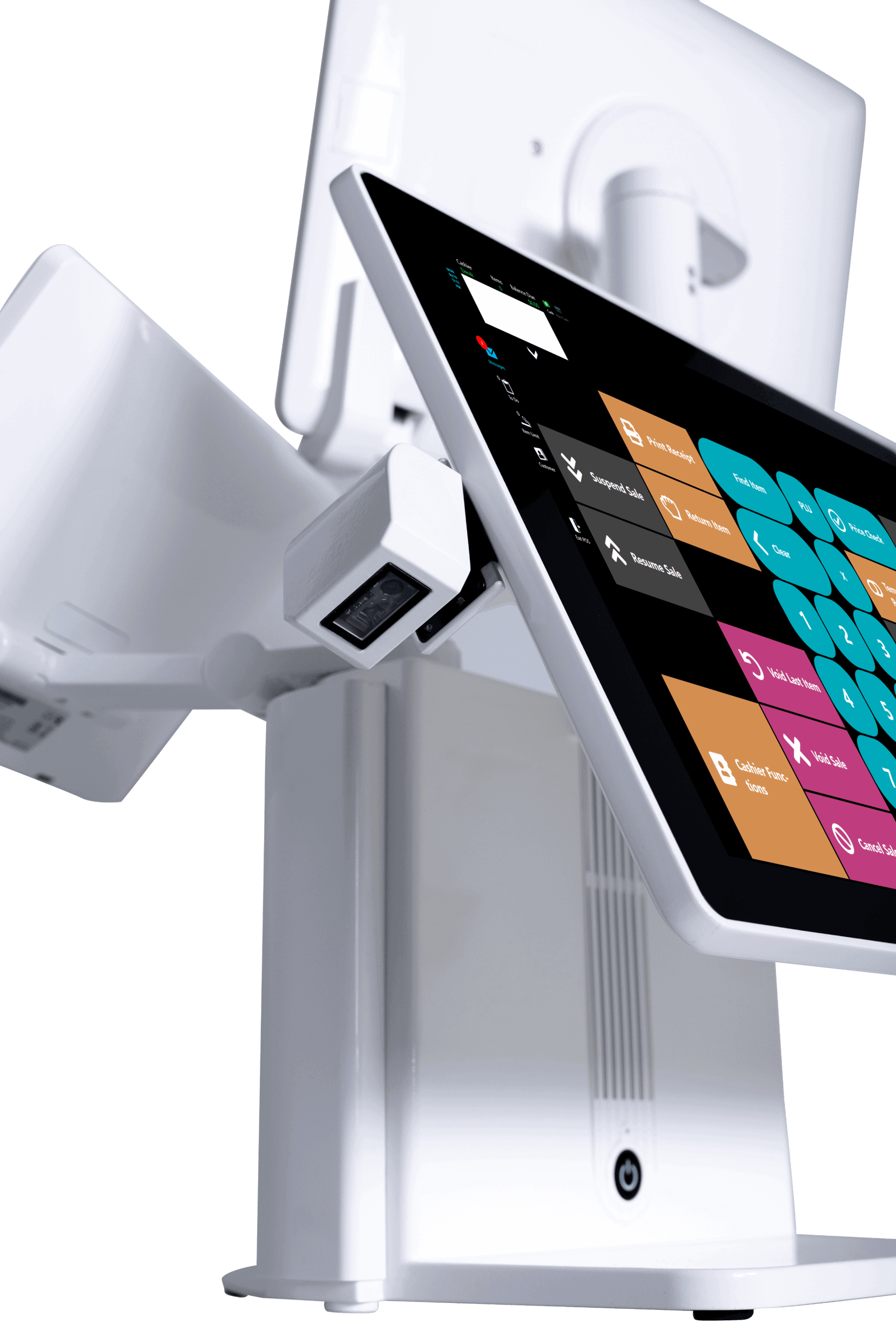 All-in-one system with i5 processor, 2D barcode scanner, 16GB RAM, fingerprint reader, one 10” customer-facing monitor + one 15” customer-facing monitor.